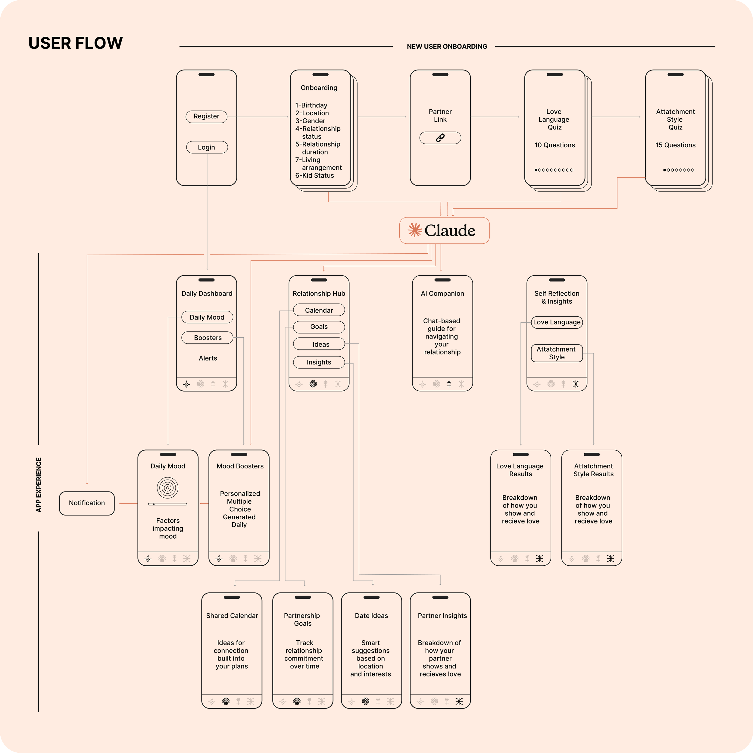 So I started building. Not through work, not with a team. Just me, because AI tools like Claude Code and Cursor suddenly made it possible. The more I built, the more ideas emerged. Features that could weave relationship insights seamlessly into daily life. Personalized experiences shaped by location, love languages, attachment styles, even mood.