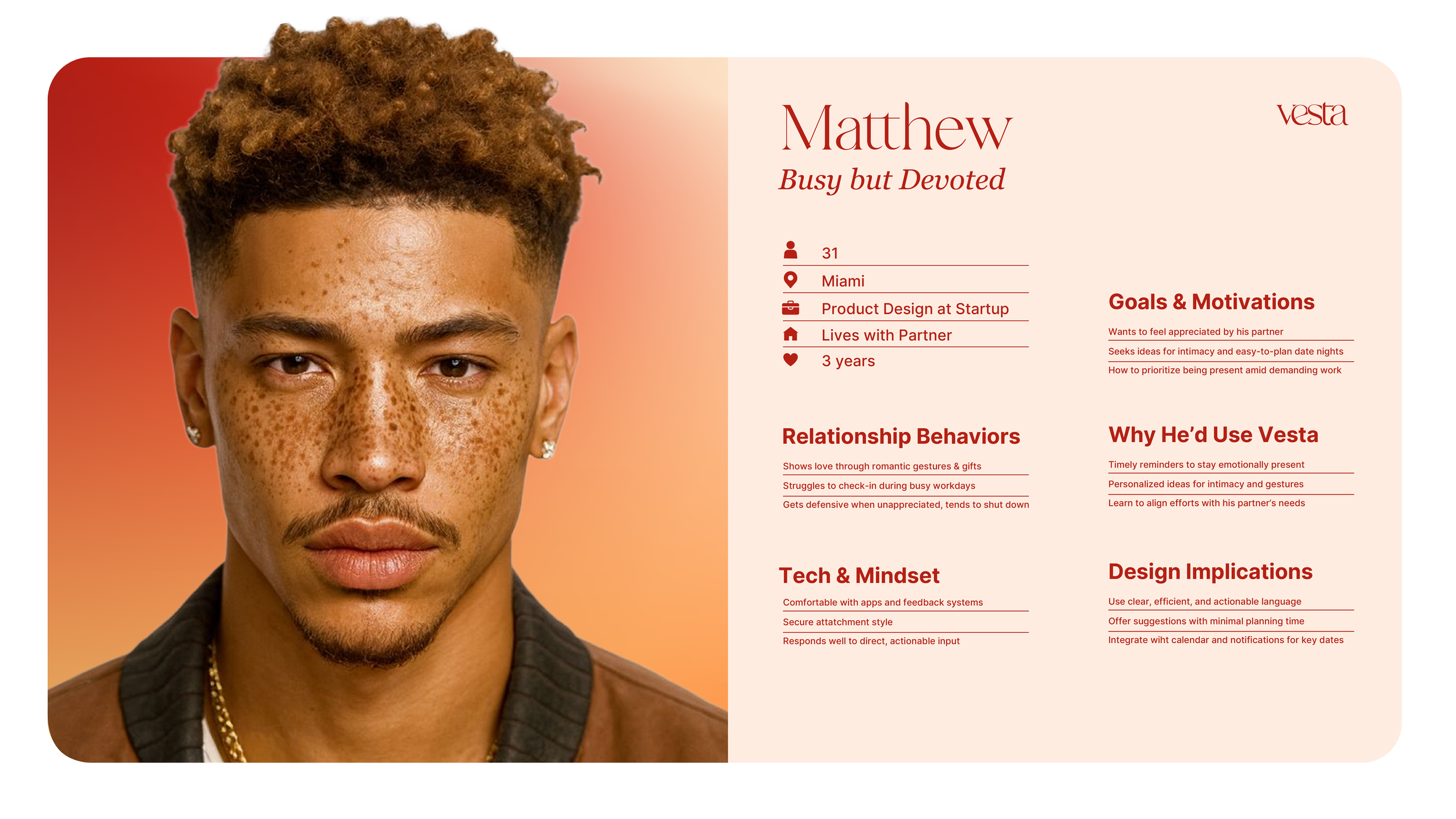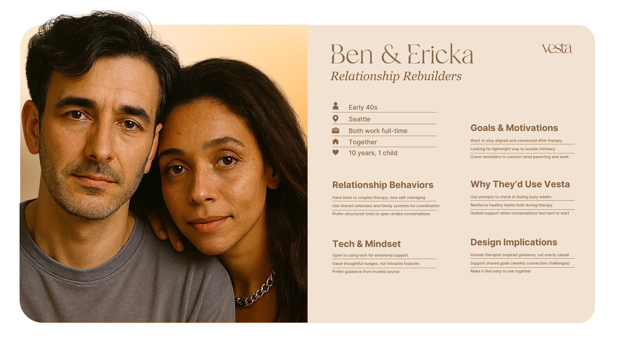 To guide my design decisions, I developed three personas representing different relationship challenges: new couples who struggle to express needs (Elyse), established partners drowning in busy schedules (Matthew), and long-term couples seeking sustainable growth tools (Ericka & Ben). These profiles shaped everything from Vesta's gentle tone to its calendar integration.