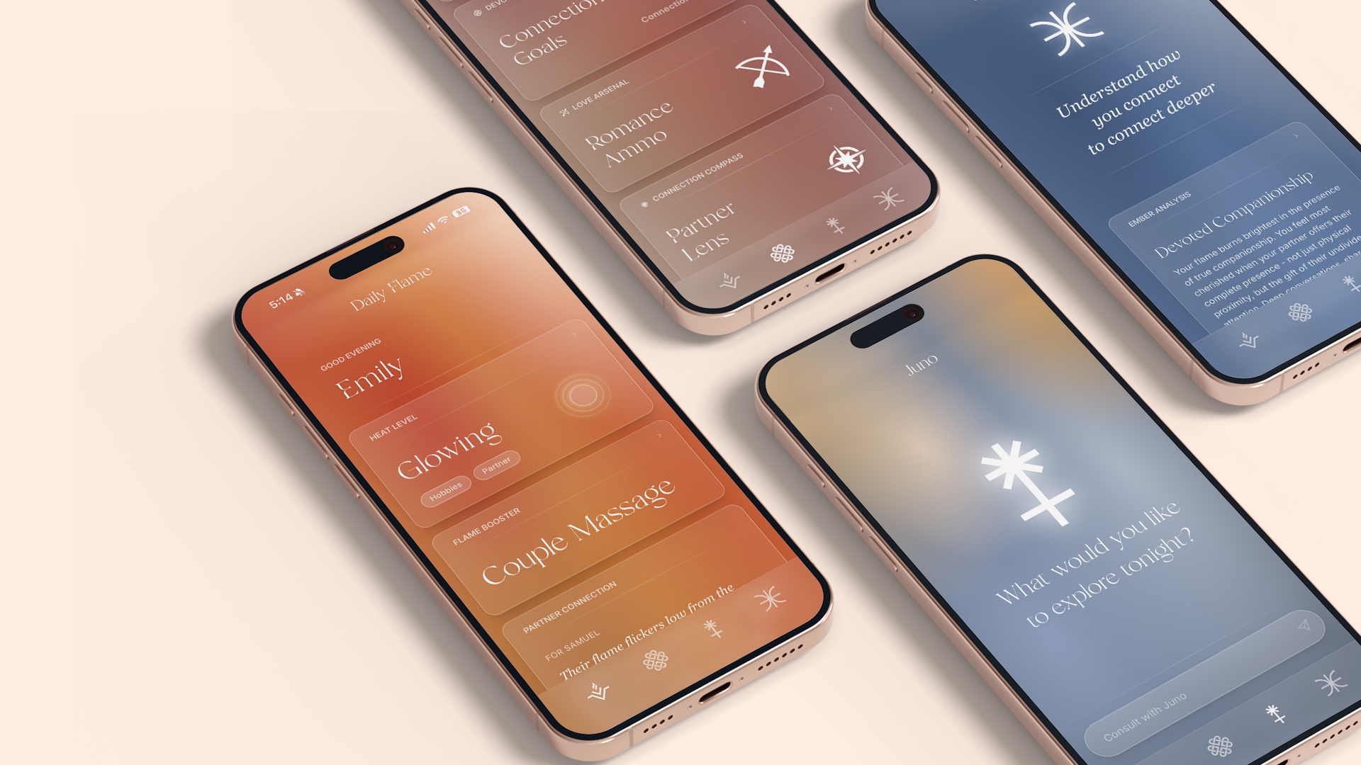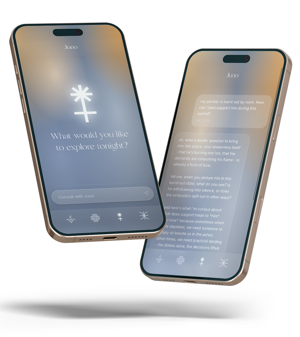 Juno speaks as a third presence in the relationship: calm, curious, and attuned. Through deliberate prompt engineering, it uses fire as its central metaphor to reinforce the brand verbally. Rather than prescriptive solutions, Juno asks reflective questions and speaks poetically yet accessibly in lowercase text, creating conversations that feel less like app advice and more like journaling with a trusted confidant.